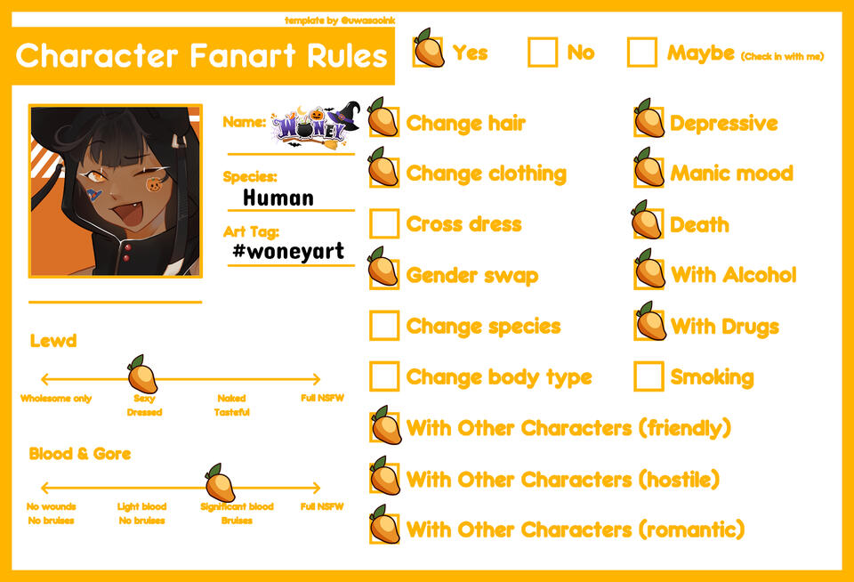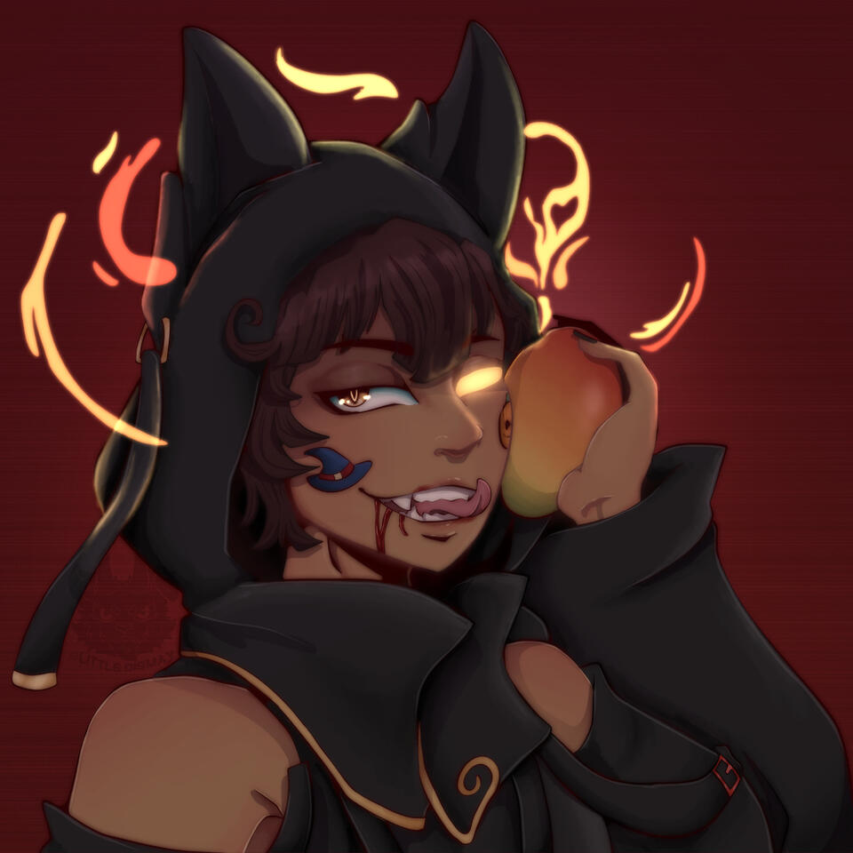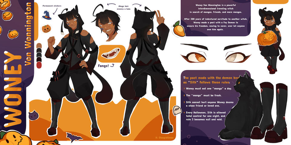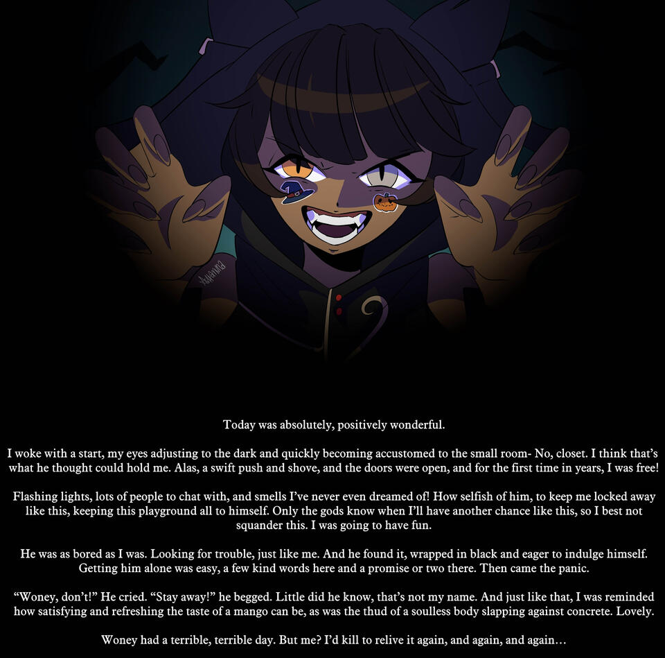 "My name, Woney, is short for "Wonderful" and "One of a Kind", and I'm an interdimensional traveler and witch. Once a familiar to a powerful witch, tasked with protecting the Feywilds from anything and everything, I sold my soul to a demon to free myself from many lifetimes of servitude, and now live with a curse too great for anyone to bare. I roam dimensions in search of a cure, eating as many mangoes as I can on my journey. And pray I eat enough to keep it happy..."